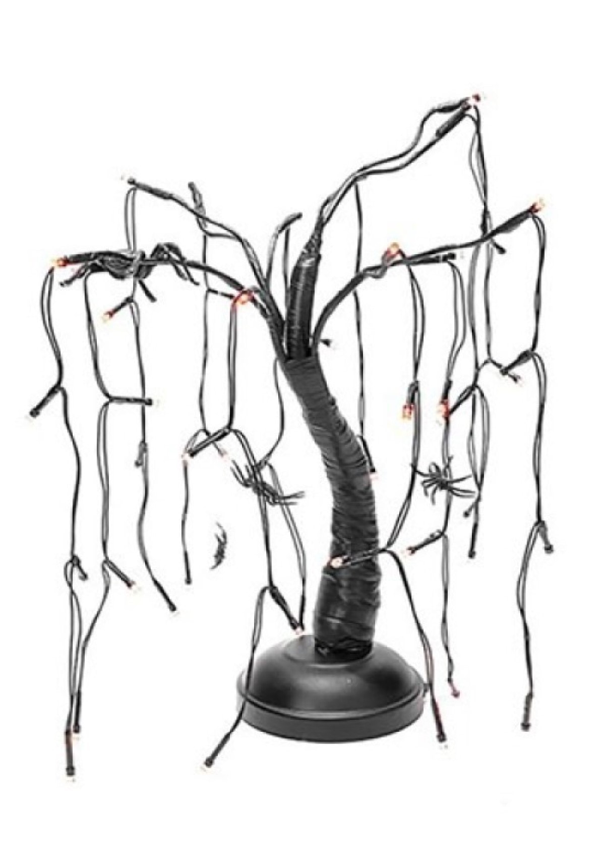 Large or small, trees are trendy for every holiday. Check out this little black tree to add to your tabletop dรฉcor for Halloween. The 48 purple LED lights turn on with the magic of 4 AA batteries.